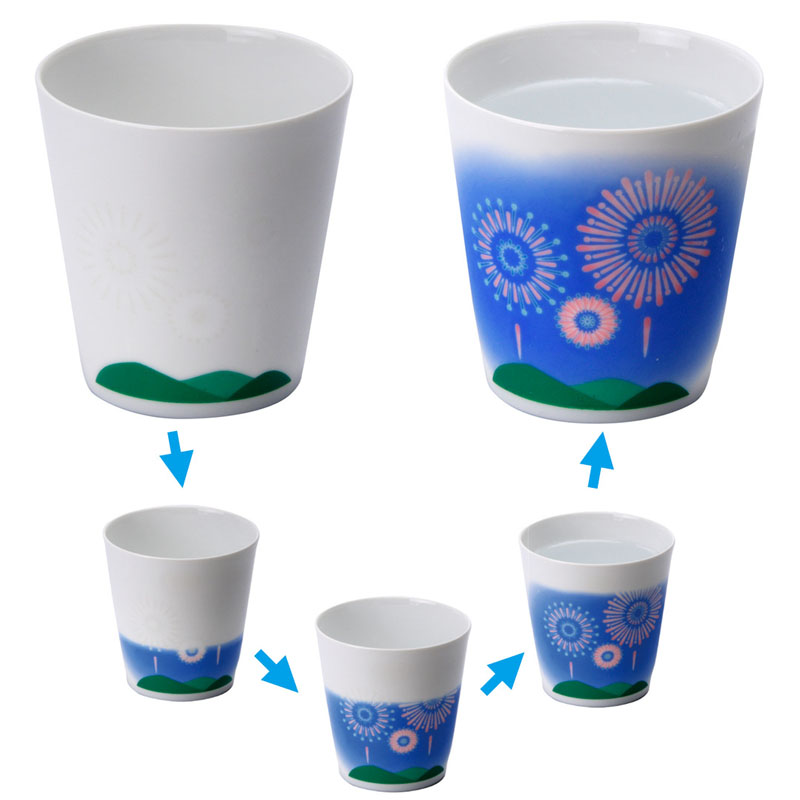 日に透けるほど薄くて軽い高級な磁器で、飲み口もスッキリとします。特殊な転写技術によって、17度以下に冷えると絵が浮き出ます。冷たい飲み物を入れて絵の変化をお楽しみください。