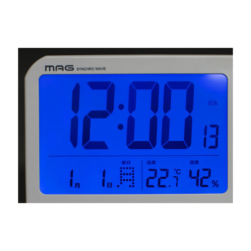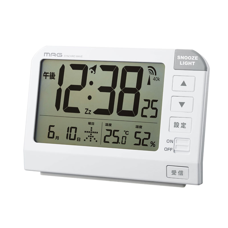 自動電波受信、温度・湿度表示、カレンダー表示、電子音アラーム、スヌーズ、ライト、12/24時間表示切替