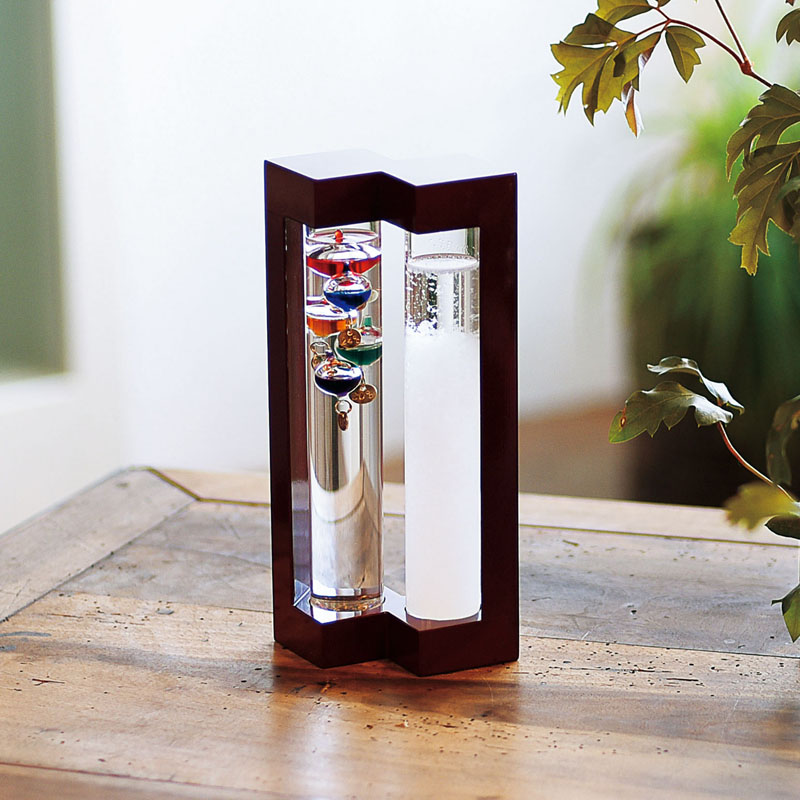 気温によってガラス球体が上下する「ガラスフロート温度計」と気象環境の変化により液体と結晶が変化する「ストームグラス」のセットです。