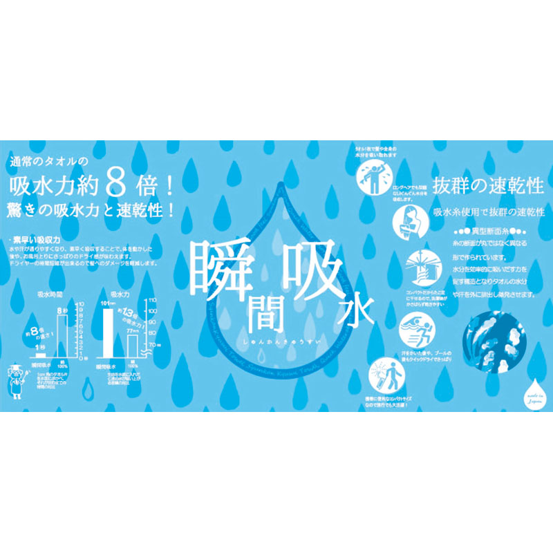 糸の断面が丸ではなく異なる形で作られている為、水分を効率的に吸い上げ放出する構造になっており、タオルの水分や汗を外に排出し蒸発させます。