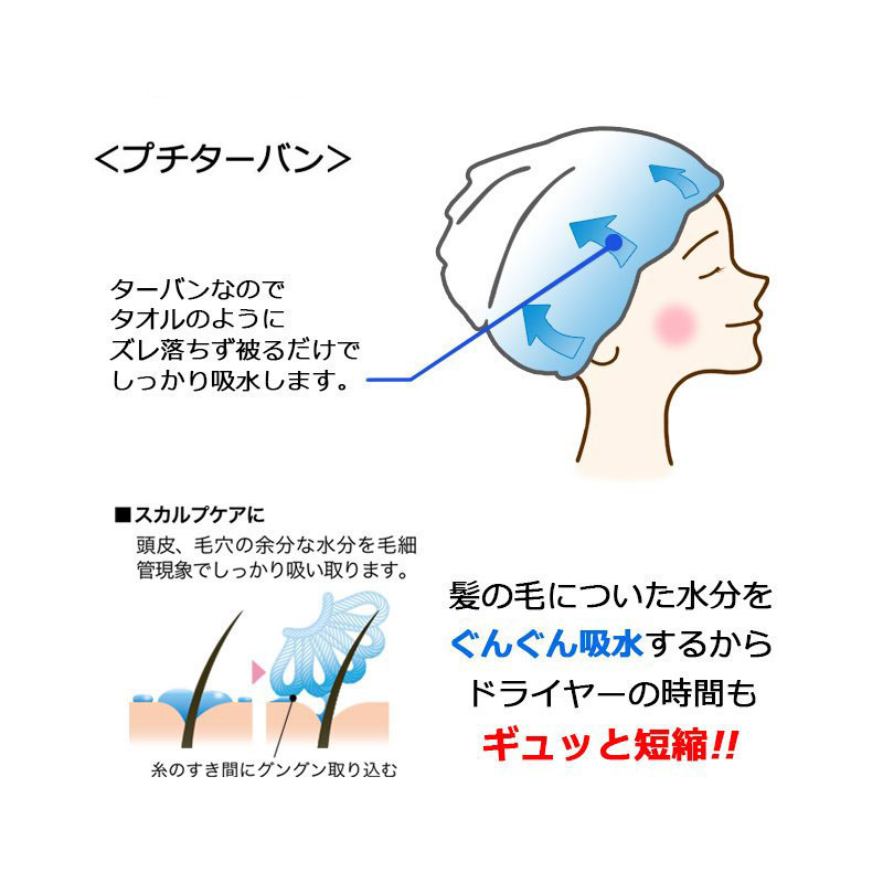 素材には、吸水抜群の撚糸『エアーかおる』を使用。水分が『エアーかおる』のパイルに触れた途端、スッと空気のすき間に吸収。 ハンドフリーで髪をタオルドライ。ドライヤーの時短にぴったりのアイテム。