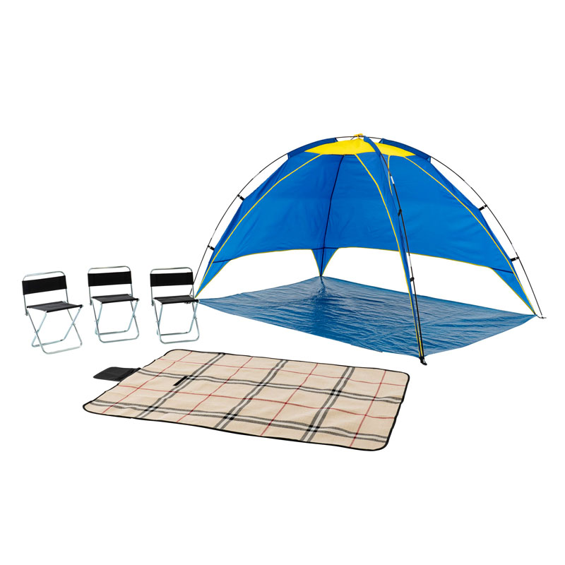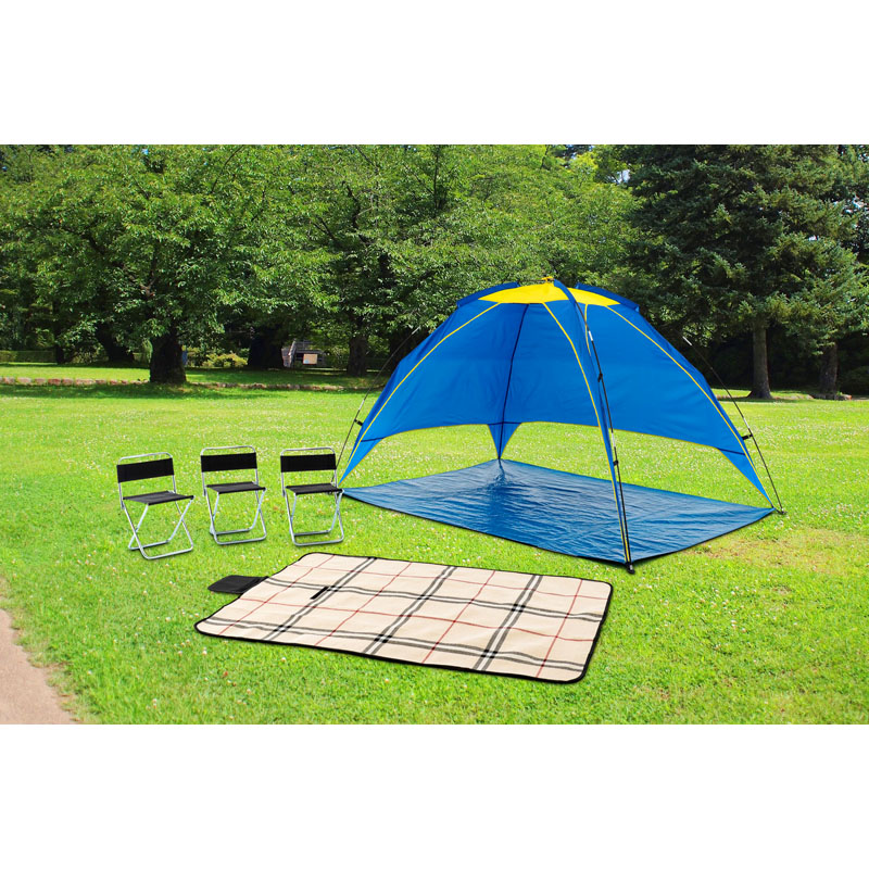 テント(1.4kg)×1(2100×1600×1300mm) (材:ポリエステル、ポリエチレン、グラスファイバー)、チェアー×3(270×285×410mm) (材:ナイロン、スチール)、レジャーシート×1(1340×980mm) (材:ポリエステル)