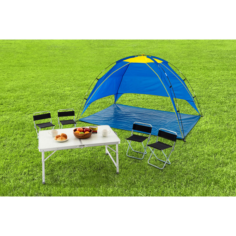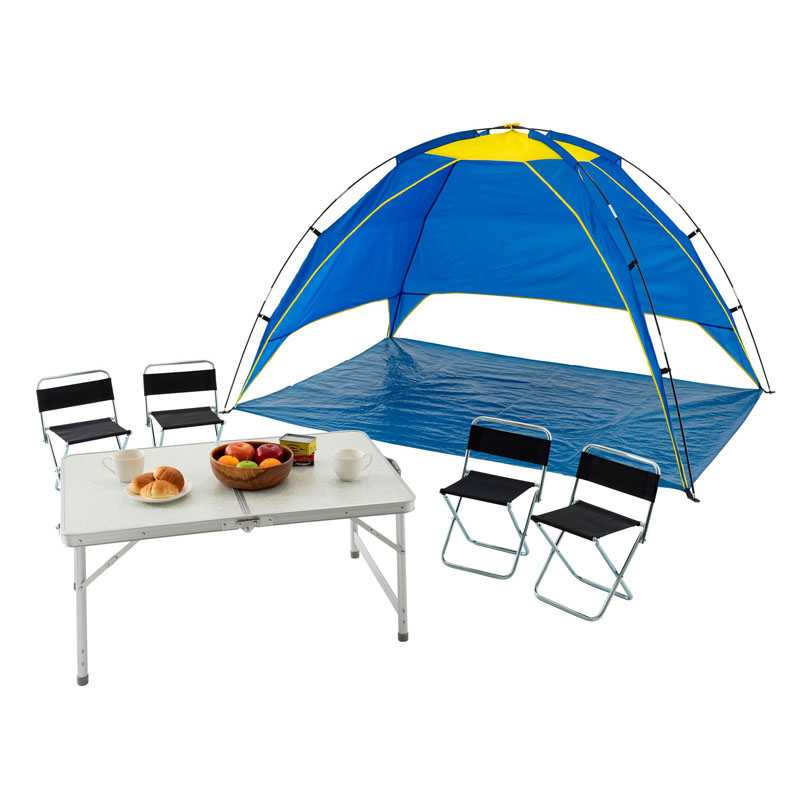 テント(1.4kg)×1(2100×1600×1300mm) (材:生地:ポリエステル、フロアー:ポリエステル、ポール:グラスファイバー)、レジャーテーブル×1(900×600×700mm) (材:合成樹脂化粧繊維板、アルミニウム合金)、チェアー×4(270×285×410mm) (材:ナイロン、スチール)
