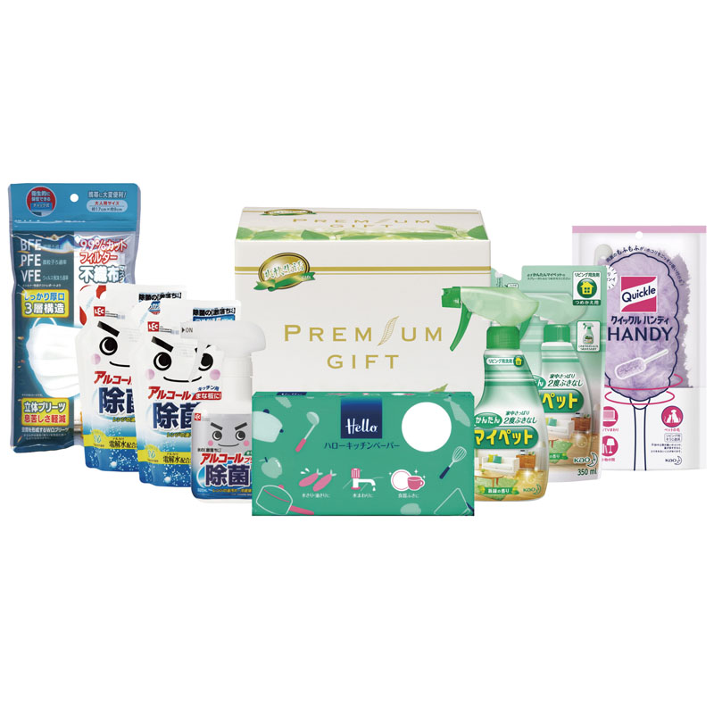 花王 かんたんマイペット本体(400ml)×1、花王 かんたんマイペット詰替(350ml)×1、花王 クイックルワイパーハンディ×1、レック 除菌の激落ちくん本体(320ml)×1、レック 除菌の激落ちくん詰替(300ml)×2、不織布マスク大人用12枚×1、ハローキッチンペーパー70枚×1