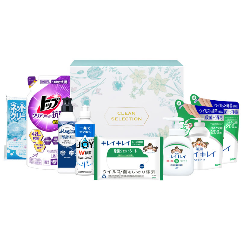 ライオン キレイキレイ薬用液体ハンドソープ本体(250ml)×1、ライオン キレイキレイ薬用液体ハンドソープ詰替(200ml)×2、ライオン キレイキレイ除菌ウェットシート10枚(アルコールタイプ)×1、P&G 除菌ジョイコンパクト(170ml)×1、ライオン Magica除菌プラス(220ml)×1、ライオン トップクリアリキッド抗菌つめかえ用(350g)×1、ネットクリーナー1P×1