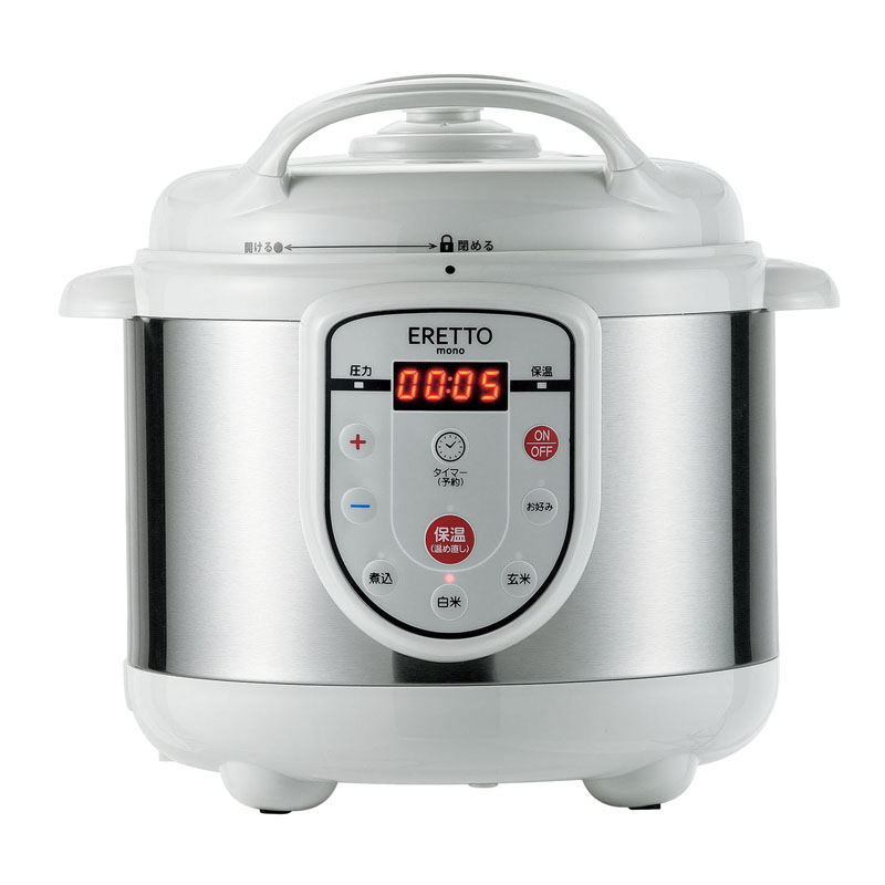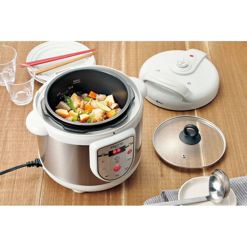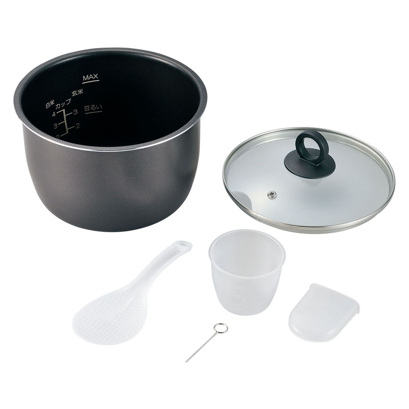 本体×1(310×290×280mm) (材:ステンレス・PP)、内鍋(3L)×1 (材:アルミニウム合金(ふっ素樹脂塗膜加工))、ガラスふた×1、しゃもじ×1、計量カップ×1、水滴受け×1、お掃除ピン×1、レシピブック×1
