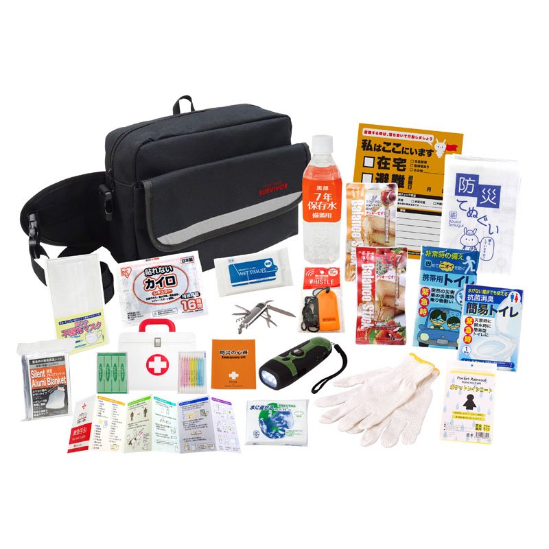 収納バッグ×1(120×310×230mm)、防災の心得×1、ホイッスル×1、カイロ×1、レインコート×1、携帯用トイレ×1、抗菌消臭トイレ×1、軍手×1、静音アルミブランケット×1、防災てぬぐい×1、ダイナモマルチライト×1、マスク×1、7年保存水(500ml)×1、バランススティック×2、8徳ナイフ×1、緊急避難カード×1、除菌アルコールウェットティッシュ×1、水に流せるペーパー×1、救急4点セット×1
