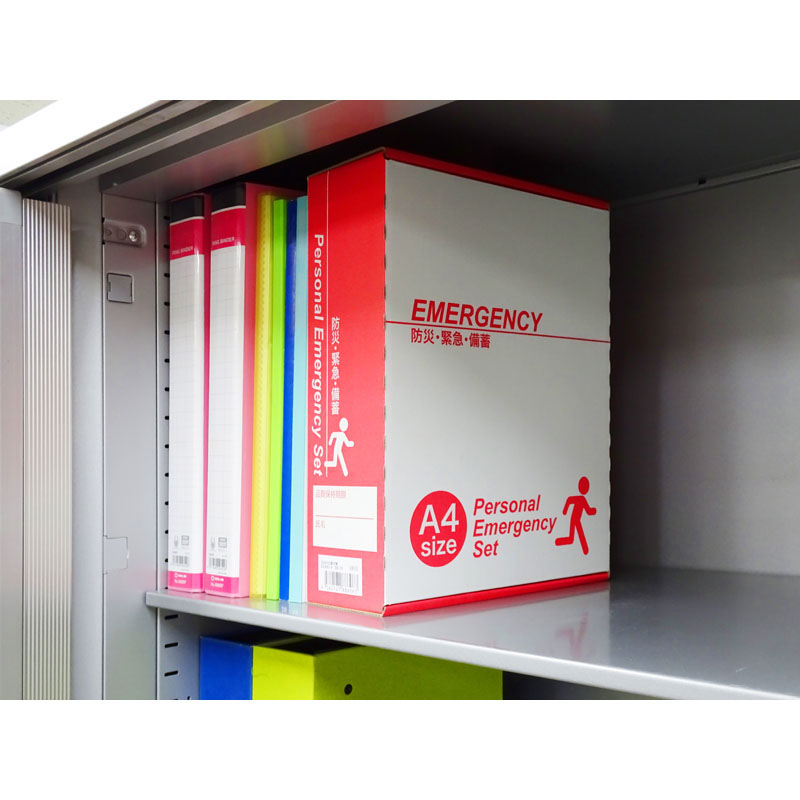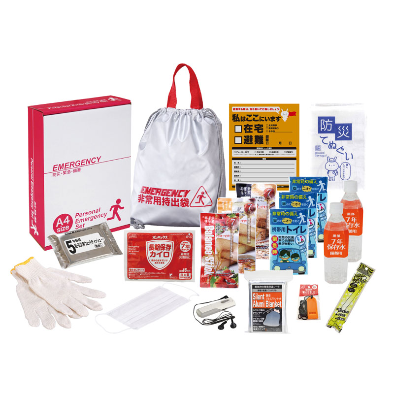 非常持出袋×1(340×390mm)、防災用ウェットティッシュ×1、静音アルミブランケット×1、カイロ×1、防災てぬぐい×1、軍手×1、バランススティック×3、マスク×1、FMラジオ×1、ホイッスル×1、携帯用トイレ×3、7年保存水(500ml)×2、緊急避難カード×1、発光スティック×1