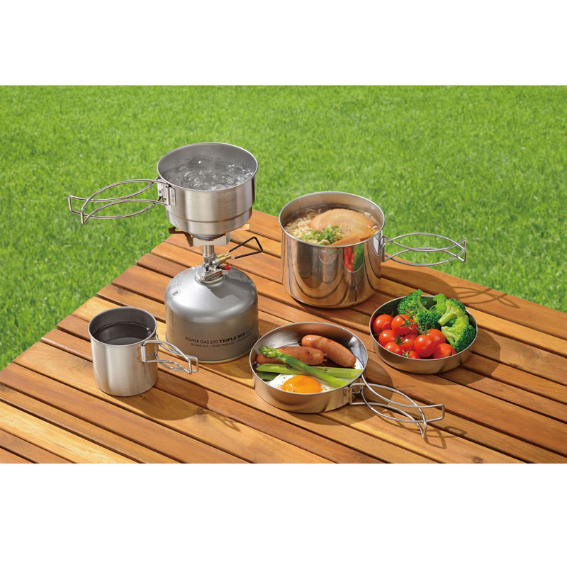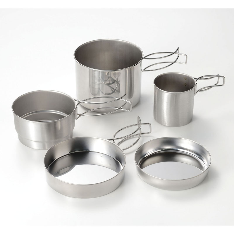 深型クッカー12cm(1L)×1、段付クッカー11cm(480ml)×1、フライパン13cm×1、マグカップ(270ml)×1、プレートトレー12cm×1 (材:ステンレス鋼)