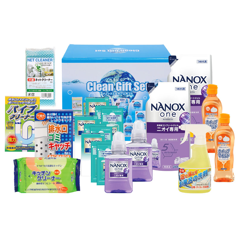 トップNANOX(380g)×2、トップNANOX2P×3、トップNANOX詰替(280g)×2、台所洗剤(250ml)×2、お風呂の洗剤スプレー(300ml)×1、キッチンクリーナー20P×1、パイプクリーナー3P×1、排水口ゴミキャッチ8P×1、抗菌ネットクリーナー×1