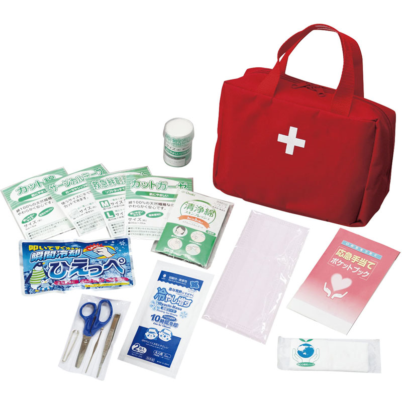 救急バッグ×1(230×100×155mm) (材:ポリエステル)、包帯×1、カットガーゼ(3枚入)×1、カット綿(3枚入)×1、救急絆創膏(2サイズ×3枚入)×1、サージカルテープ×1、清浄綿(2枚入×3包)×1、ハサミ×1、ピンセット×1、耳かき×1、毛抜き×1、冷却パック×1、ECO便利バッグ×1、マスク×1、熱救急シート(2枚入)×1、応急手当てポケットブック