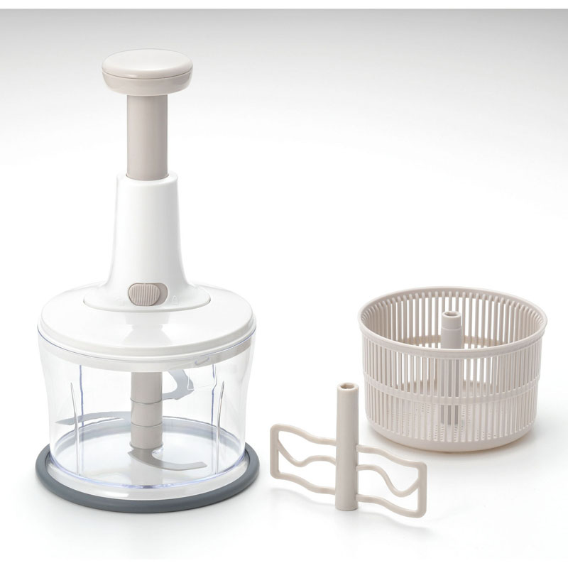 上から押すだけで簡単にみじん切りができ、押す回数で食材の細かさを調整できます。また、付属の部品を使用すれば、水切り器や泡立て器としてもお使いいただけます。