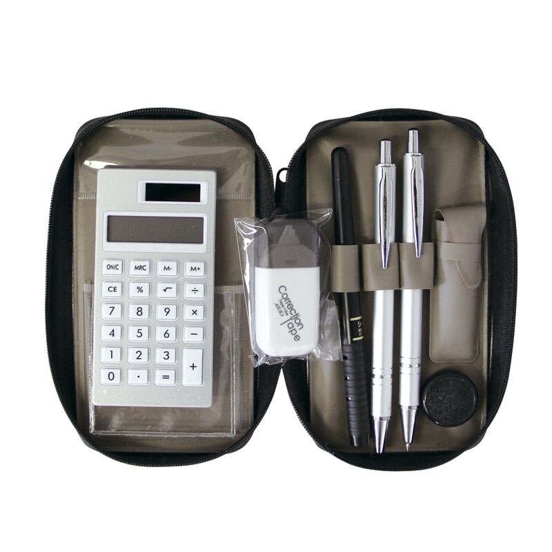 ペンケース×1(150×85×27mm) (材:PVC)、ボールペン×1(φ10×140mm) (材:アルミ)、シャープペン×1(φ10×140mm) (材:アルミ)、消しゴム(替え芯付)×1(φ10×130mm) (材:ABS)、修正テープ×1(56×27×12mm) (材:ABS)、電卓×1、朱肉×1