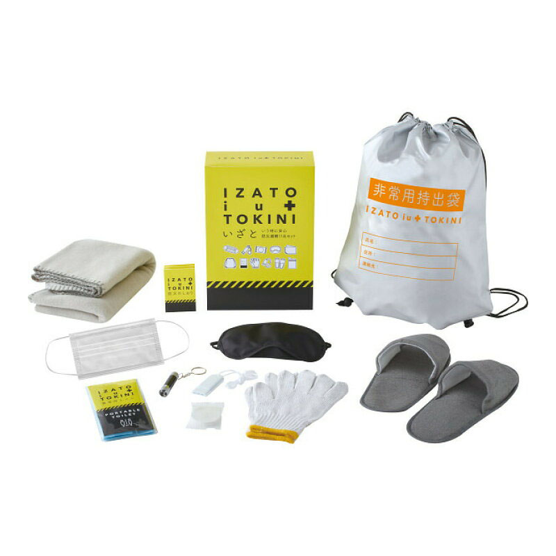 難燃持出袋×1 (材:ポリエステル)、ミニLEDライト×1、フラットホイッスル×1、圧縮タオル×1、ブランケット×1(1800×1050mm)、防災のしおり×1、マスク×1、アイマスク×1、折りたたみスリッパ×1、携帯トイレ×1、軍手×1