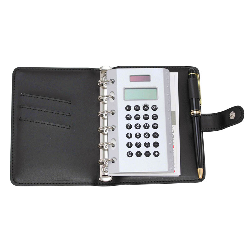 システム手帳×1(145×105×23mm) (材:PU)、ボールペン(8g)×1(φ9.3×136mm) (材:ABS)、電卓(40g)×1(125×75×7mm) (材:ABS)