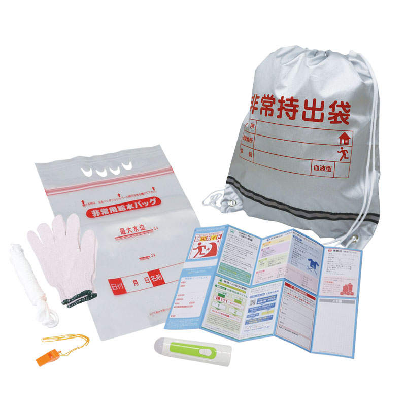 非常袋×1(440×380mm) (材:ポリエステル)、非常用給水バッグ(3L)×1、ハンディライト×1、軍手×1、ロープ(3m)×1、笛×1、防災ガイド×1
