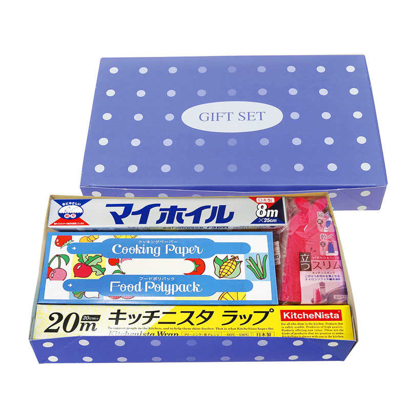 立つスリムキッチンスポンジ×1、クッキングペアーセット(ポリ袋・キッチンペーパー各10枚)×1、アルミホイル(25cm×8m)×1、キッチニスタラップ(30cm×20m)×1