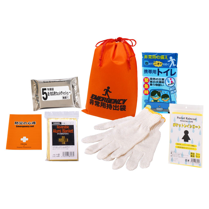 収納巾着袋×1(220×165mm)、防災用ウェットティッシュ×1、アルミブランケット×1、レインコート×1、携帯用トイレ×1、軍手×1、防災の心得×1