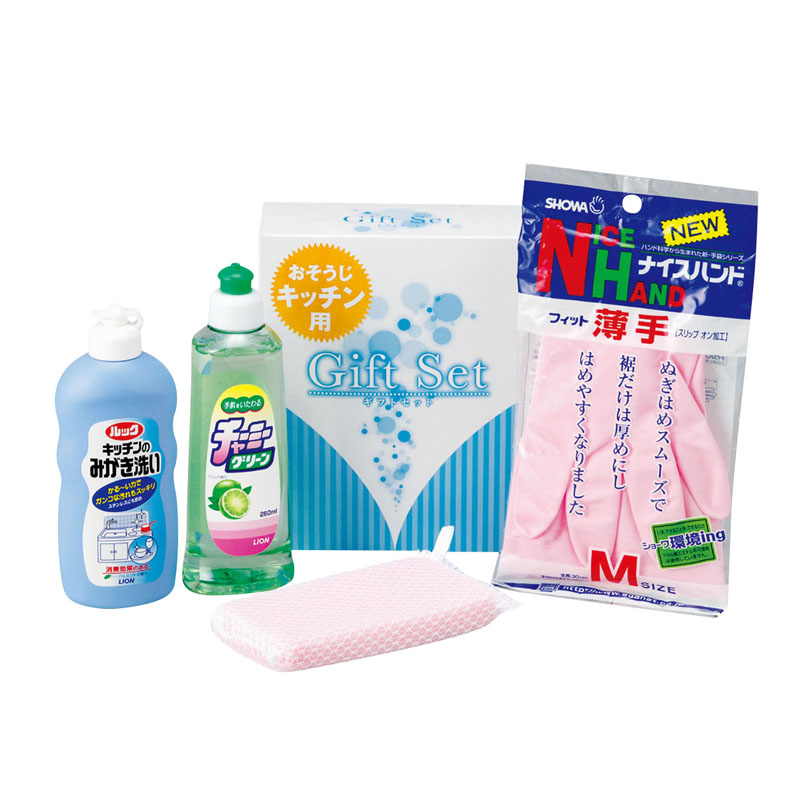 キッチンのみがき洗い×1、チャーミーグリーン(260ml)×1、ゴム手袋×1、スポンジ×1