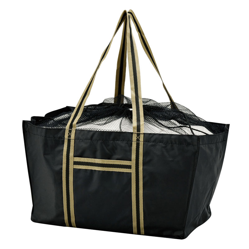 レジかごにぴったりはまるエコバッグです。 メッシュ巾着で荷物がこぼれるのを防ぎます。 前面にはポケットがついています。