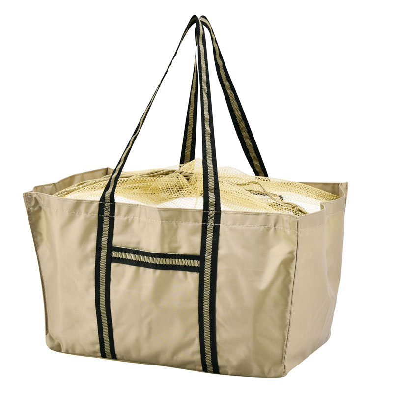 レジかごにぴったりはまるエコバッグです。 メッシュ巾着で荷物がこぼれるのを防ぎます。 前面にはポケットがついています。