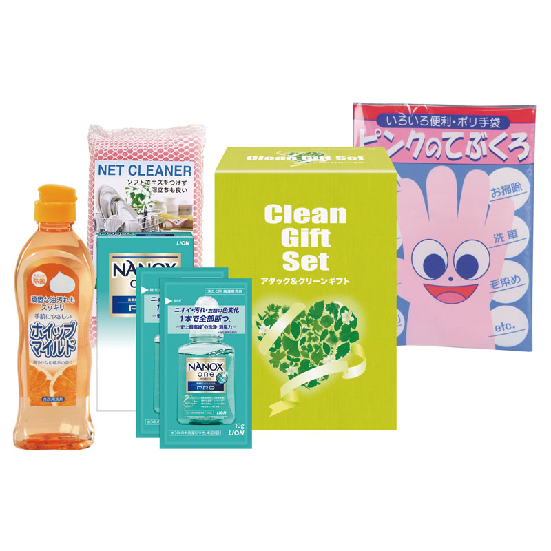NANOX2P×1、台所洗剤(250ml)×1、ネットクリーナー×1、ピンクの手袋5P×1