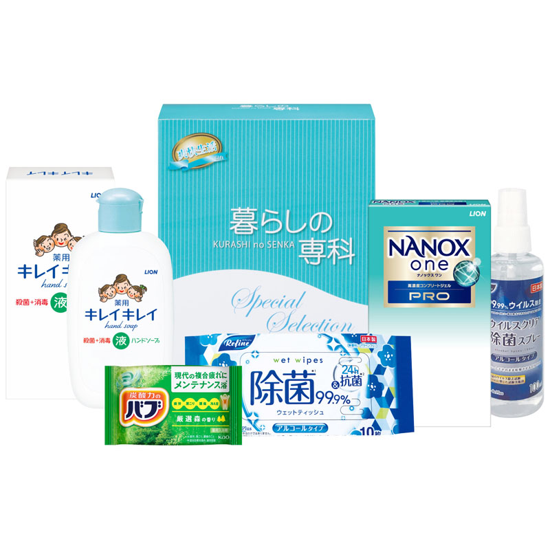 ライオン キレイキレイ薬用液体ハンドソープ箱入(120ml)×1、リファイン ウイルスクリアアルコール除菌スプレー(100ml)×1、ライオン NANOXonePRO2P×1、花王 バブ 森×1、リファイン アルコール除菌ポケットウェットティッシュ10枚×1