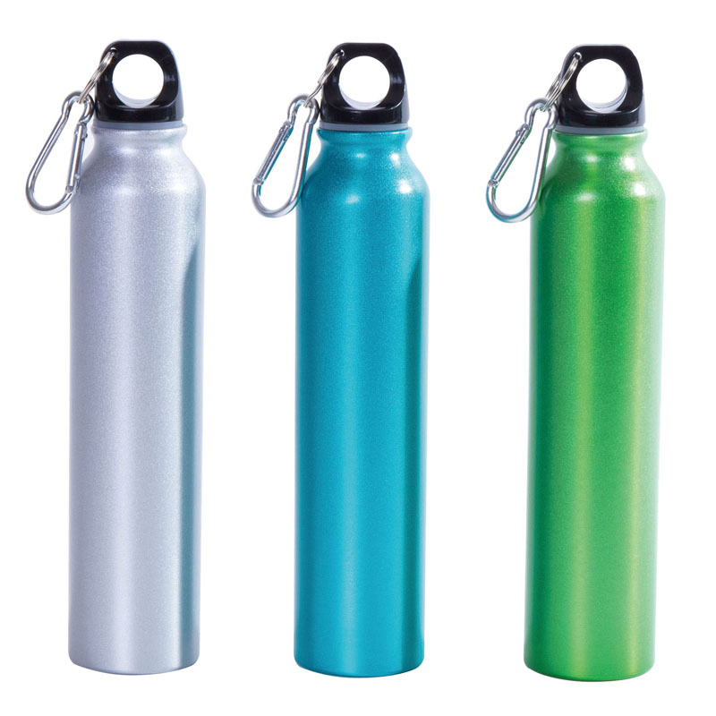 カバンの中で場所を取らないスリムなアルミボトル。 携帯に便利なカラビナ付き。
