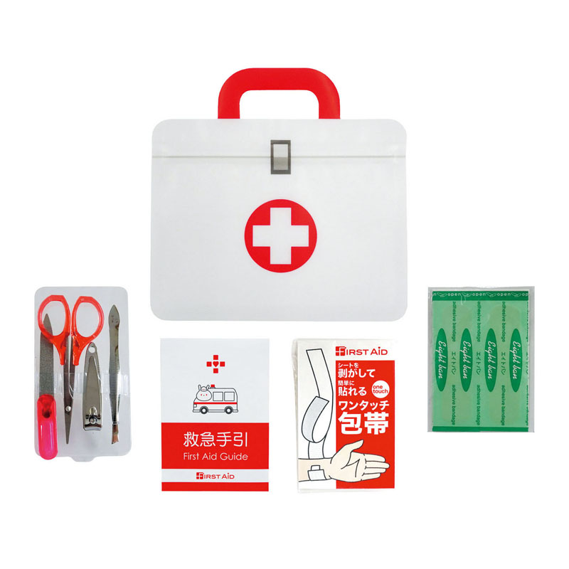 救急ジッパーポーチ×1(50×140×138mm) (材:PET・ポリエチレン・ポリプロピレン)、絆創膏5P×1、ワンタッチ包帯×1、救急手引×1、ネイルケア4点セット×1