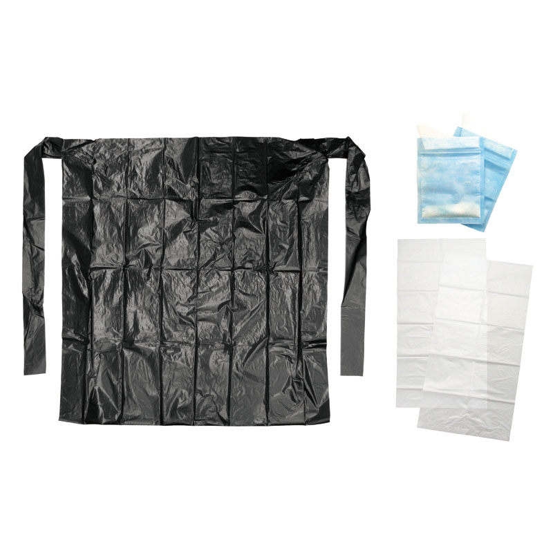 凝固剤入り尿処理袋(19g)×2(230×152mm) (材:ポリエチレン、高分子吸収樹脂)、持ち帰り袋(3g)×2(185×384mm) (材:ポリエチレン)、前掛けシート(10g)×1(610×648mm) (材:ポリエチレン)