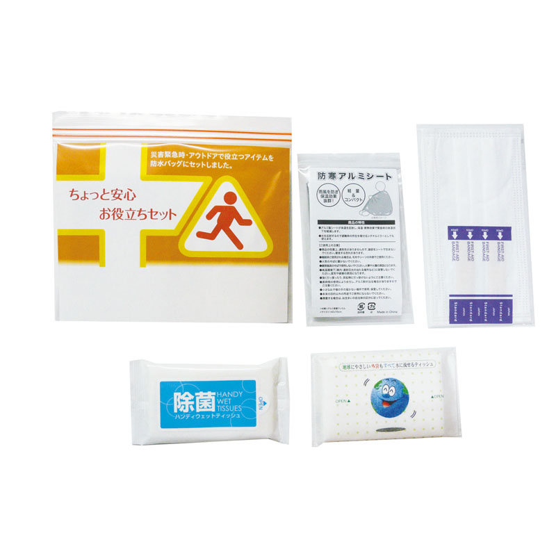 ウェットティッシュは除菌タイプ、ティッシュは袋も全て水に流せます。雨風を防ぎ保温効果のあるアルミブランケット、マスクと絆創膏M2枚をセット。