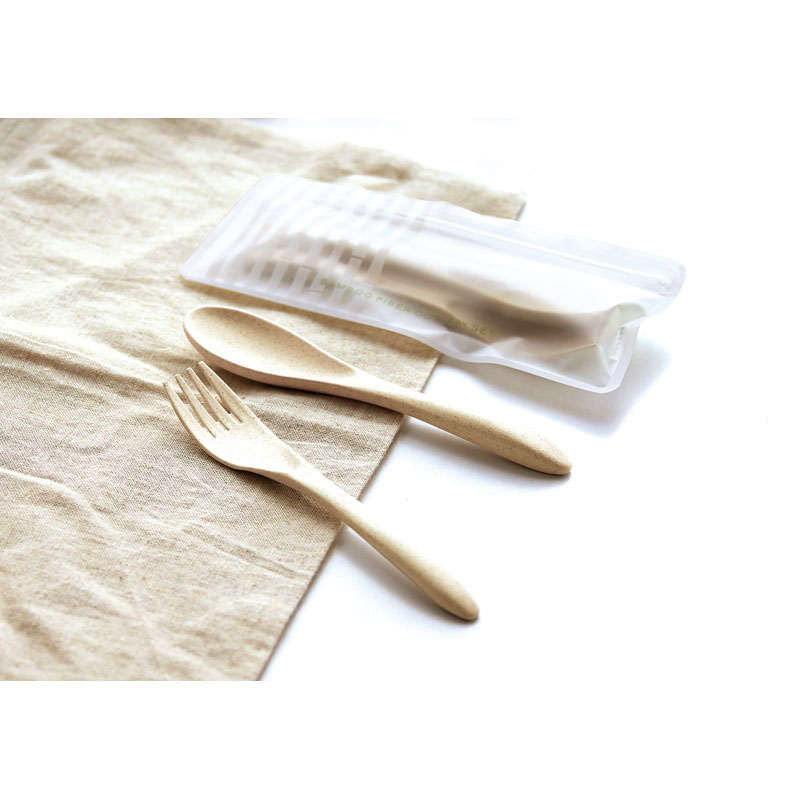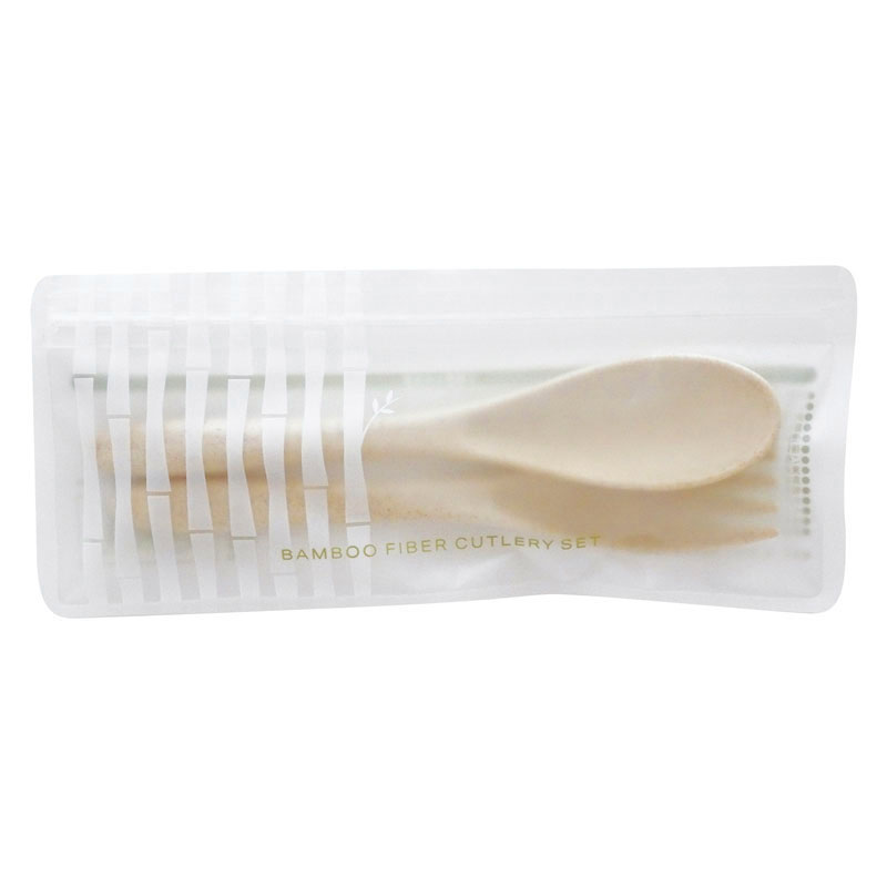 ジッパーケース×1(80×185×15mm)、スプーン(12g)×1(30×160mm) (材:PP70%、バンブーファイバー30%)、フォーク(7g)×1(26×155mm) (材:PP70%、バンブーファイバー30%)