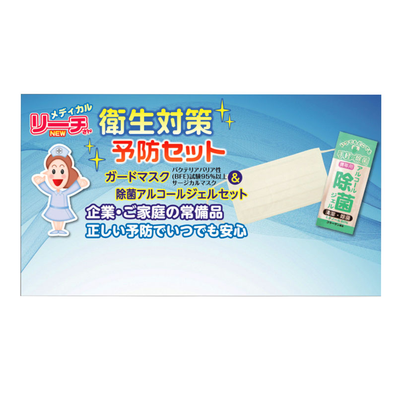 サージカルマスク×1 (材:不織布)、携帯用アルコール除菌ジェル(1.5ml)×1 (材:エタノール、水、PG、TEA、カルボマー、コラーゲン)