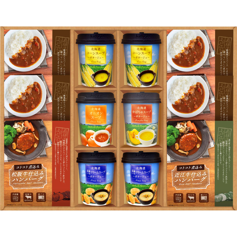 北海道スープ(男爵いもポタージュ)(20g)×2、北海道スープ(コーンポタージュ)(16.5g)×2、北海道スープ(かぼちゃポタージュ)(16.5g)×1、北海道スープ(オニオン)(7g)×1、松阪牛仕込みハンバーグ(150g)×1、近江牛仕込みハンバーグ(150g)×1、レストランビーフカレー(200g)×4