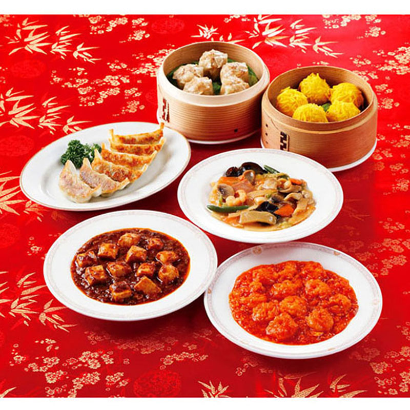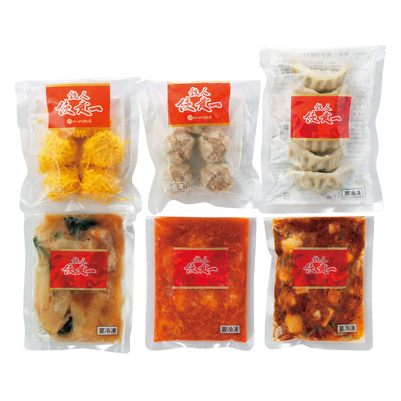 餃子(6個120g)×1、貝柱入焼売(5個150g)×1、錦糸焼売(5個125g)×1、乾焼蝦仁(150g)×1、本格四川麻婆豆腐(150g)×1、本格八宝菜(150g)×1