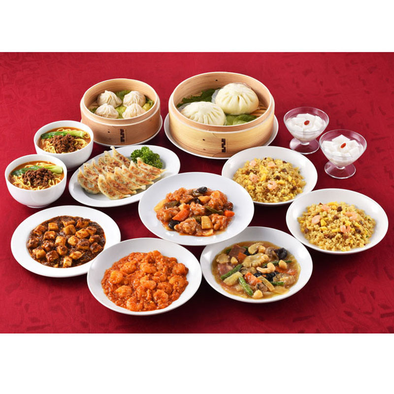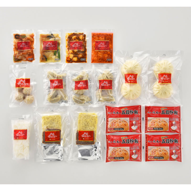 餃子(6個120g)×3、本格四川麻婆豆腐(150g)×1、乾焼蝦仁(エビチリソース)(150g)×1、本格八宝菜(150g)×1、酢豚(150g)×1、小籠包(4個入140g)×1、手包み肉まん(2個入240g)×2、ふっくら五目炒飯(200g×2)×2、担ー麺セット326g(麺200g、ごまだれ38g、液体スープ58g、ザージャン(肉みそ)30g入)×2、杏仁豆腐(500g)×1