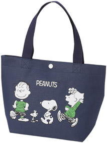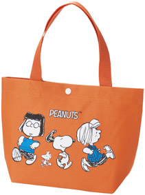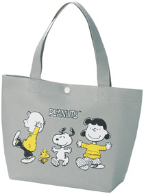 落ち着いたトーンのスヌーピーアイテム。 開口部にボタン付きで中のものが飛び出しにくく、 お弁当の持ち運びやちょっとしたお出かけに最適。