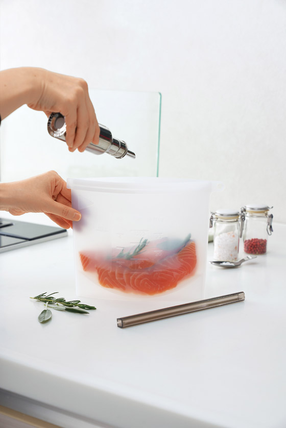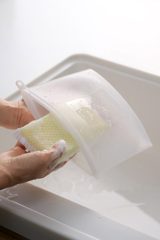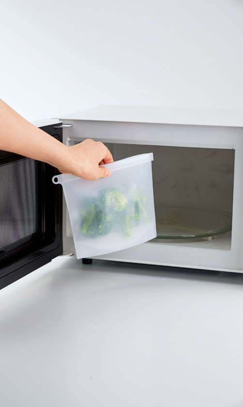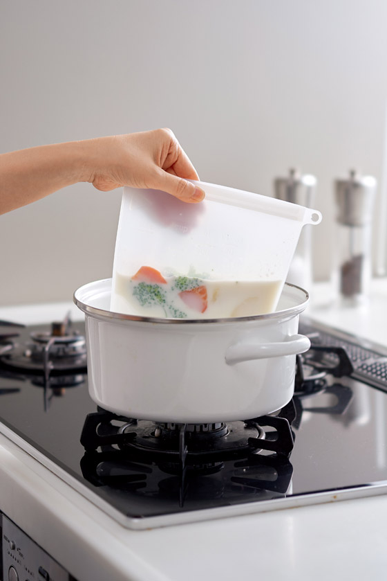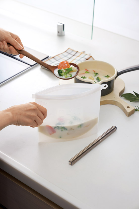 SPソースとニトリパブリックの共同開発商品。 そのまま冷凍・解凍・電子レンジ調理ができる、 シリコーン製の調理保存袋です。