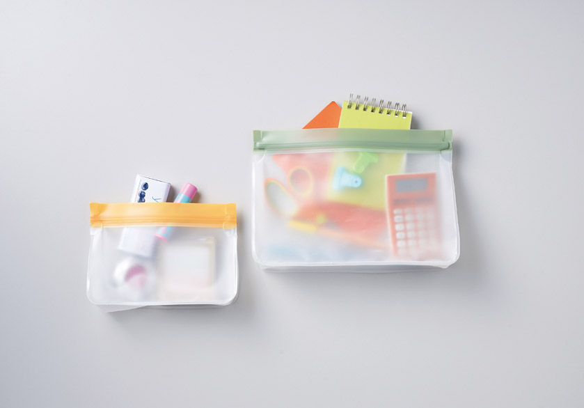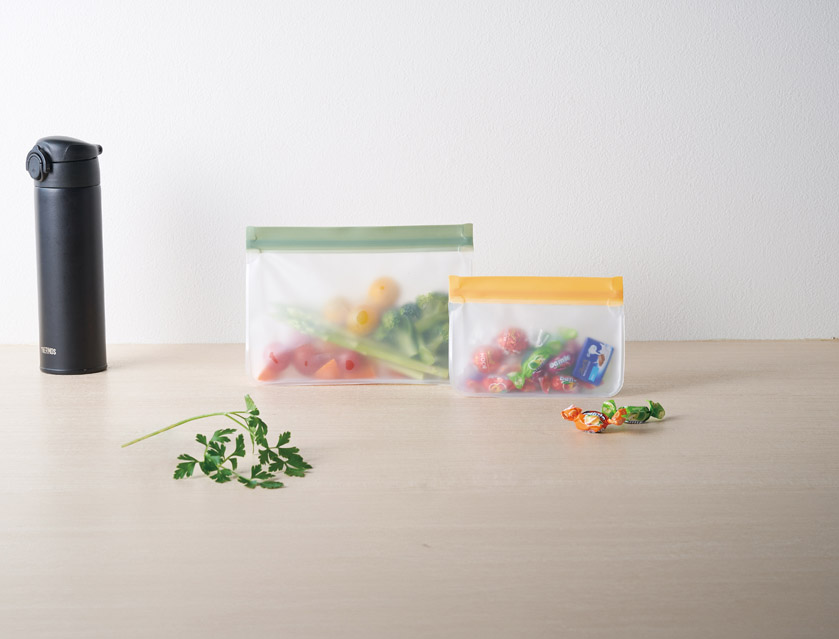 環境負荷が低くリサイクルしやすいPEVA素材使用、 洗って繰り返し使えるのもポイント。 大小2サイズの保存用ジッパーバッグです。