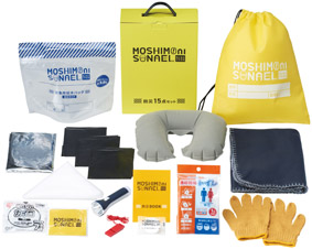 セット内容/持出袋・給水バッグ3L・LEDライト・ホイッスル・アルミシート(1200×800mm)・グローブ・圧縮タオル(240×400mm)・三角巾・ポリ袋×3・防災ブック・携帯簡易トイレ・ブランケット(600×900mm)・エアー枕・使いきりカイロ・ポケットティッシュ、ライト/単三乾電池1本使用(別途)