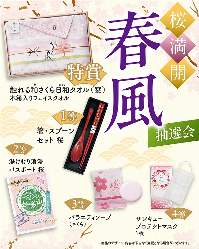 <キット内容> [特賞]触れる和さくら日和(宴) 木箱入りフェイスタオル・・・1本 [1等]箸・スプーンセット 桜・・・2本 [2等]湯けむり浪漫 バスポート 桜・・・4本 [3等]バラエティソープ(さくら)・・・8本 [4等]サンキュープロテクトマスク1枚・・・35本 <付属品> 抽選くじ×50、抽選箱×1、くじ明細書×1、告知用A4カード×1 ※賞品の内容・仕様は画像と異なる場合があります。あらかじめご了承ください。