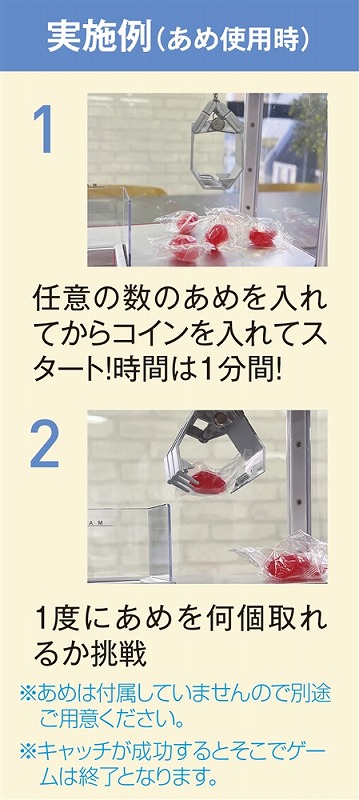 キャンディーくらいの大きさが取りやすくておすすめです! にぎやかな音楽が流れ、まるでゲームセンターのような雰囲気に!残り時間が少なくなると、テンポが早くなってドキドキ倍増!制限時間は1分間です。キャッチが成功するとそこでゲームは終了となります。