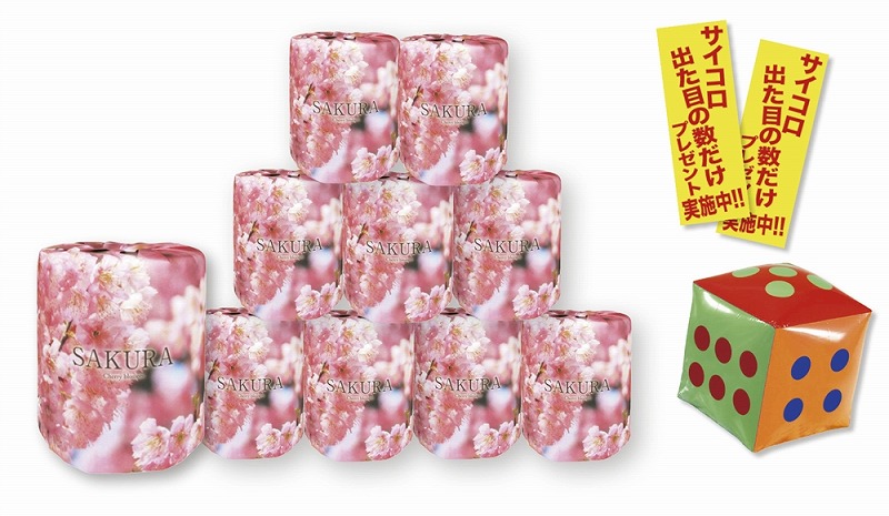 30cm角の大きいサイコロをお客様に振って頂き、出た目の数だけトイレットペーパーをプレゼントする参加型イベント。桜のデザインのトイレットペーパーは並べて店頭に置くとお客様の目をひきます。ペーパーにも桜のプリント入