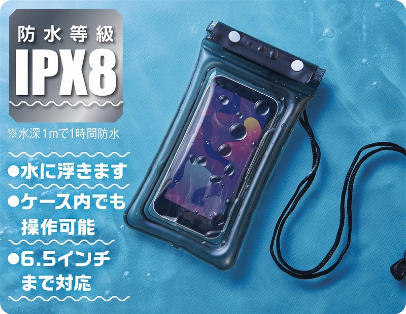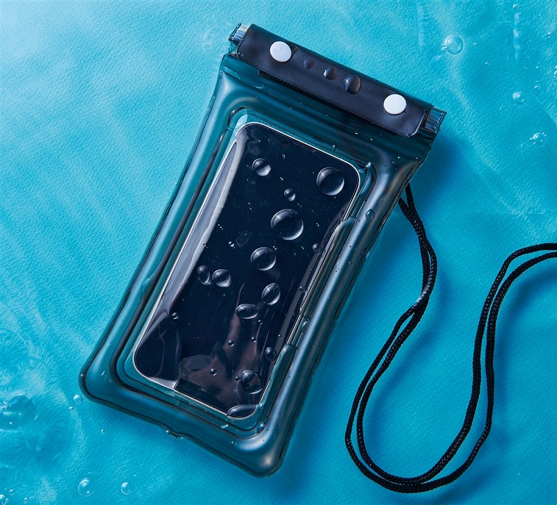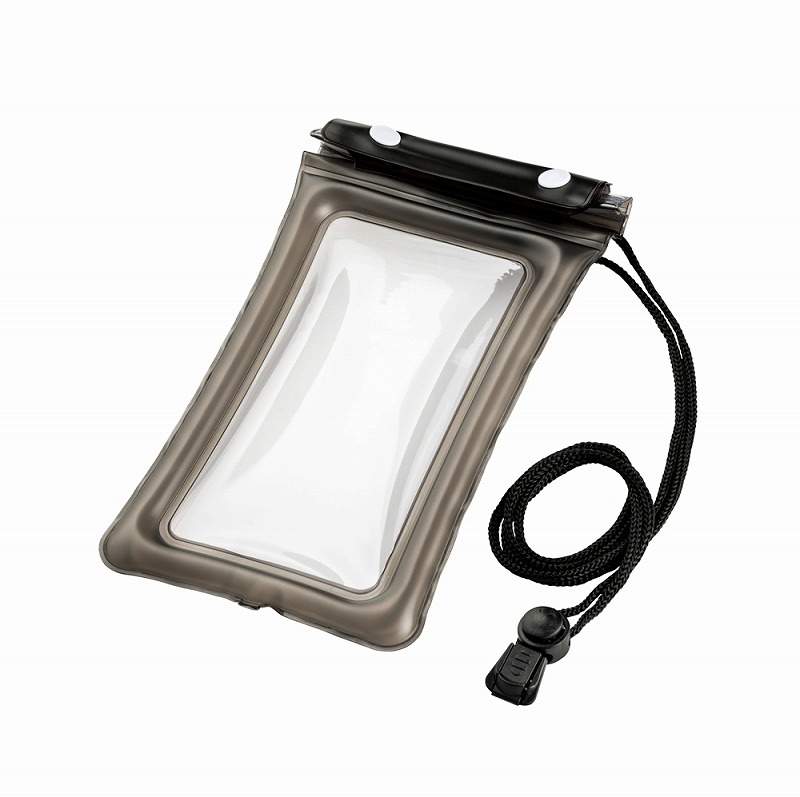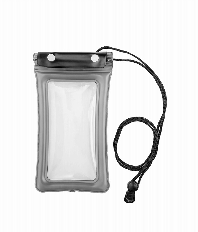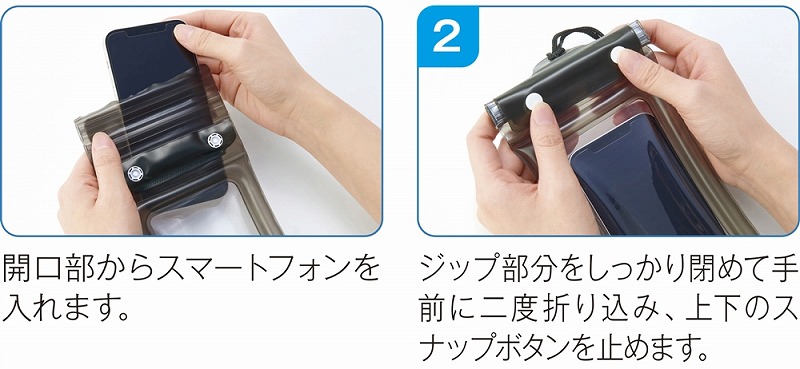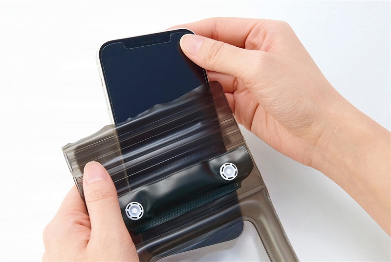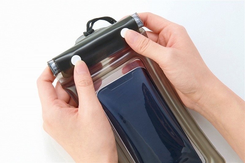 ジップ部分をしっかり閉めて手前に二度折り込み、上下のスナップボタンを留めます(※使用前に必ず防水チェックを行ってください)。6.5インチサイズのスマートフォンまで対応。水に浮きます。