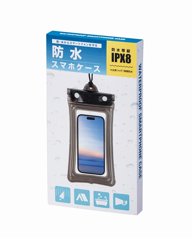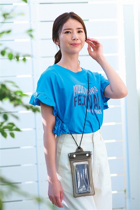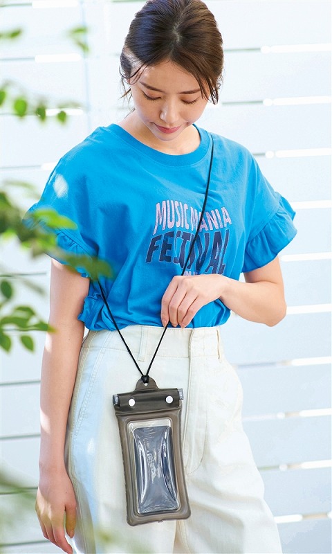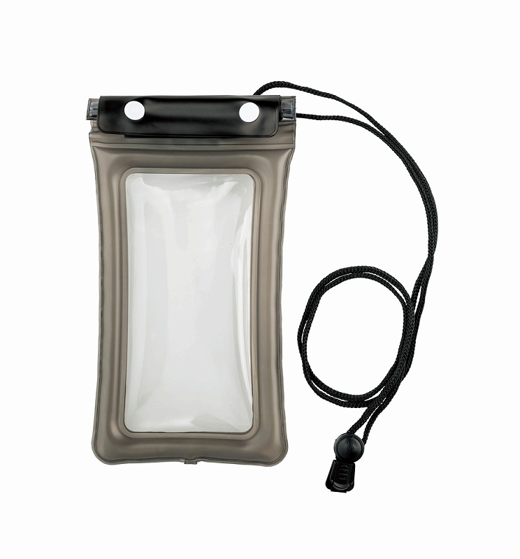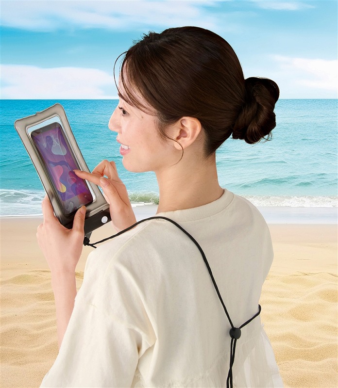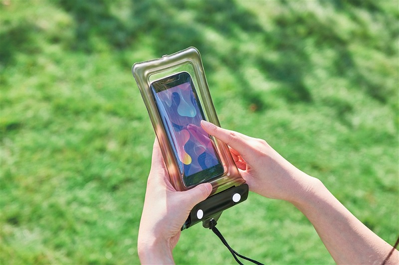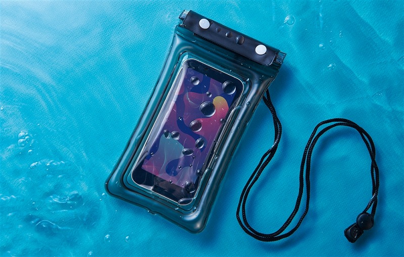 ジップ部分をしっかり閉めて手前に二度折り込み、上下のスナップボタンを留めます(※使用前に必ず防水チェックを行ってください)。6.5インチサイズのスマートフォンまで対応。水に浮きます。