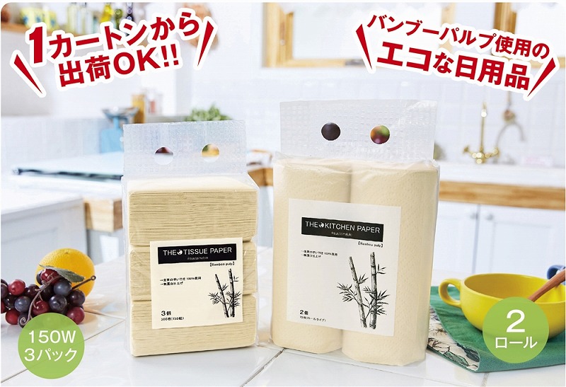 大きすぎず小さすぎないサイズ感のソフトパック仕様。1カートン(60組入)から出荷できる日用消耗品としても注目です!竹のパルプで作った環境配慮型のティッシュペーパー。どんどん成長する竹は伐採しても再度植える必要がない”地球にやさしい天然素材”。サステナブルな素材としても注目を集めています。