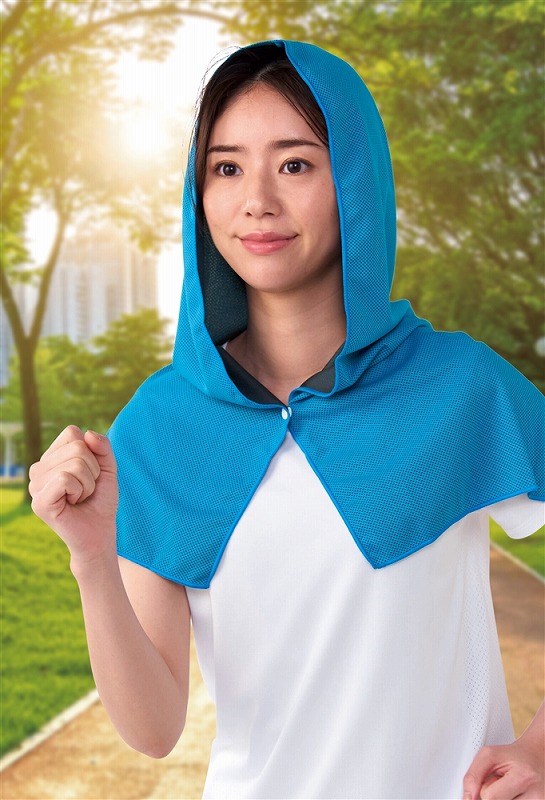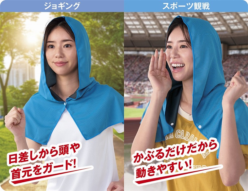 水に濡らしてしぼってクールダウン。日差しのほか、急な雨のときもサッとかぶれる!ジョギングやスポーツ観戦時にも大活躍です。フロントのボタンでずれずに快適。お子様の公園遊びに付き添うママたちにも。