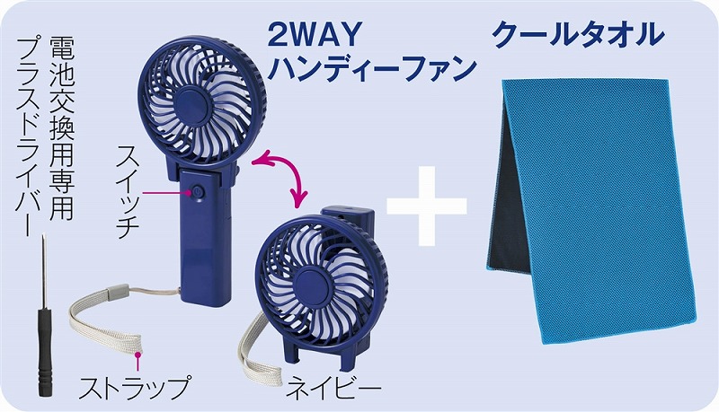2WAYハンディーファン/本体/ABS樹脂・羽根/ポリプロピレン ストラップ/ナイロン・ポリプロピレン クールタオル/ポリエステル 専用ドライバー/スチール・ポリプロピレン