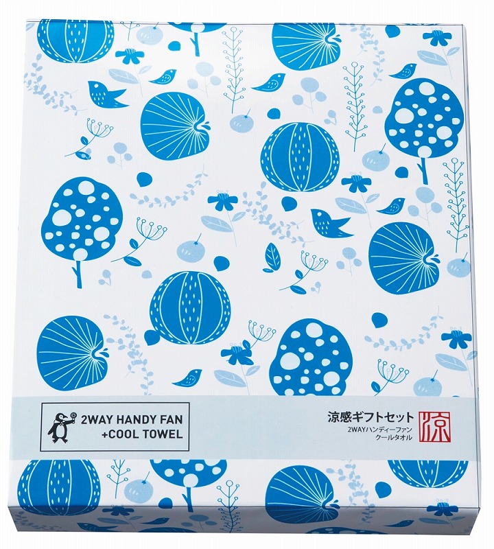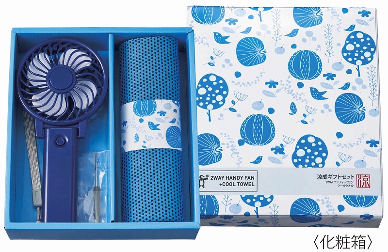 ひと味ちがったお中元?涼を誘うデザインのギフトパッケージに、外出に欠かせないハンディーファンと濡らして涼しいクールタオルをセットしました。