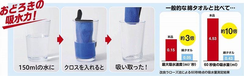 この特別なタオルは一般的な綿タオルの約10倍の吸水力を持っています。洗車や窓拭き、お掃除に最適です。検証動画も用意。販促品として配布すれば企業やお店のイメージ向上と売り上げ増に寄与します。 ※綿タオルが0.43mlに対し、本品は4.53mlの吸水力。
